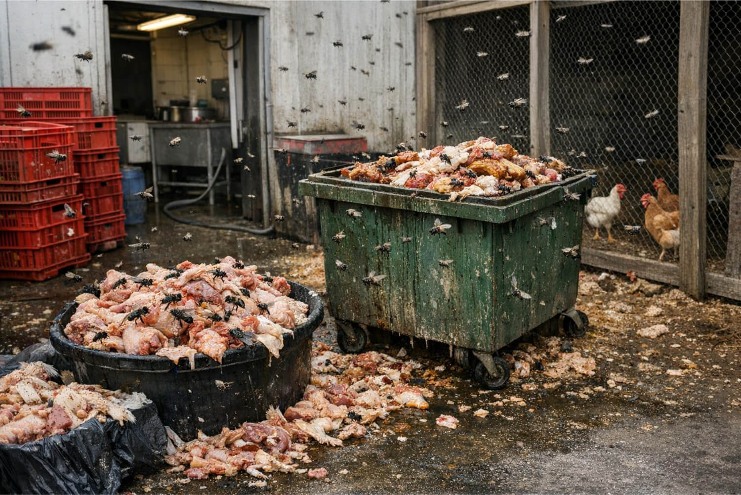During a routine inspection, the client reported persistent fly activity near the back door crate washing area, located close to waste disposal points containing unused chicken parts and near the chicken coop area. These organic waste materials created a strong attraction point for flies, increasing the risk of flies entering the building and affecting hygiene standards within the production facility.