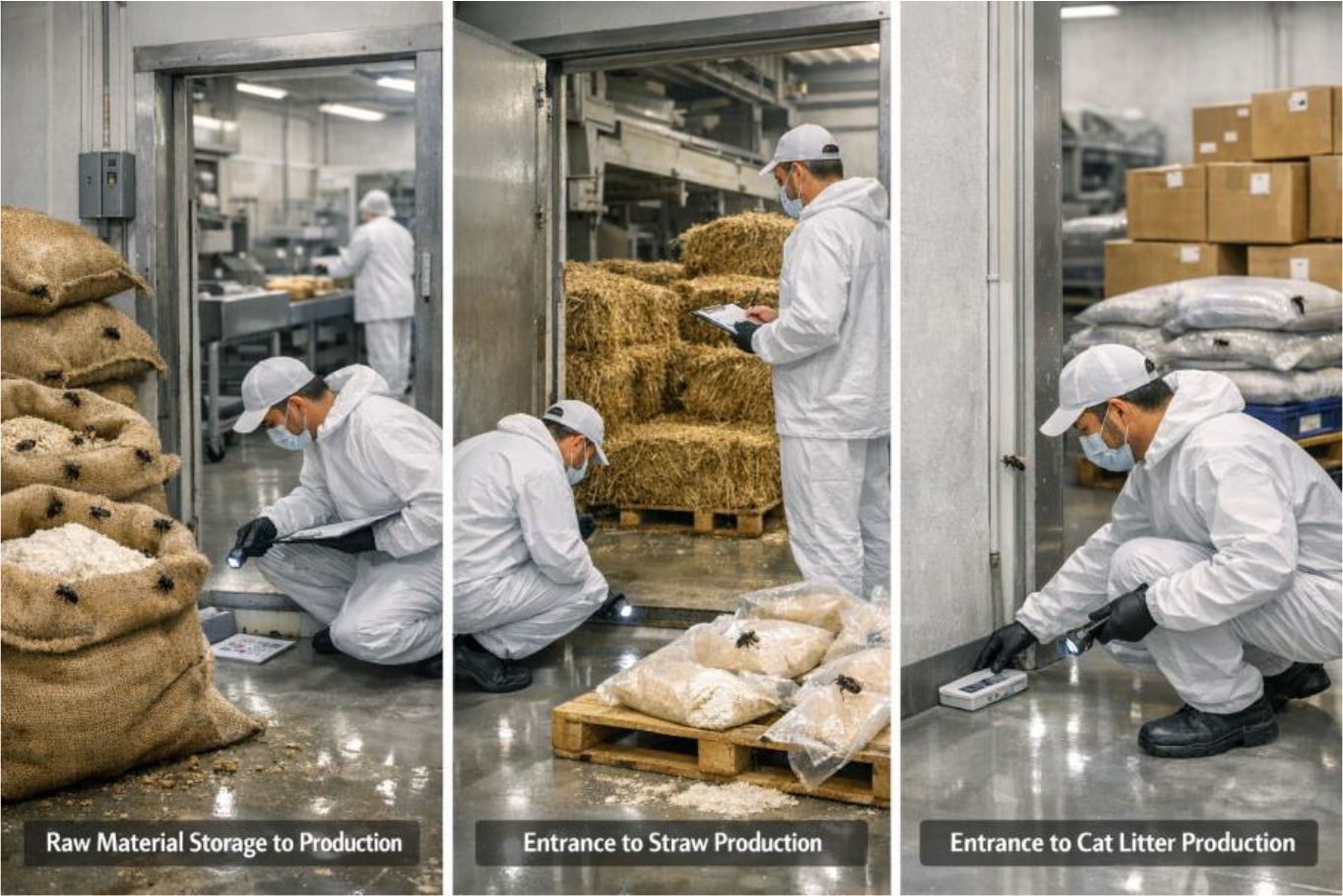 During the site inspection, technicians conducted monitoring at several locations, including the raw material storage to production entrance, entrance towards straw production, and entrance towards cat litter production. Observations revealed signs of pest presence, including small flies, large flies, lizards, shoe prints, and bird fur, indicating possible pest entry points and fly activity around these areas.